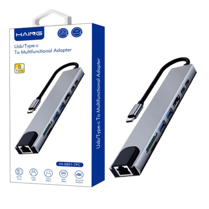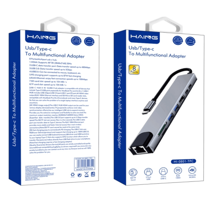 Haing 8-in-1 USB & Type-C to Multi-Function Adapter | 4K HDMI, USB 3.0, SD/TF Card Reader, 87W PD Charging